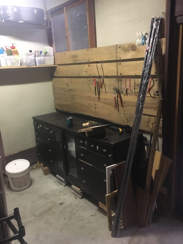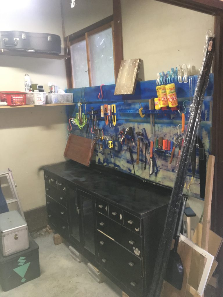 なもんで壁一面に道具が見えるように、これまたあるもので収納道具を作っていたわけです。