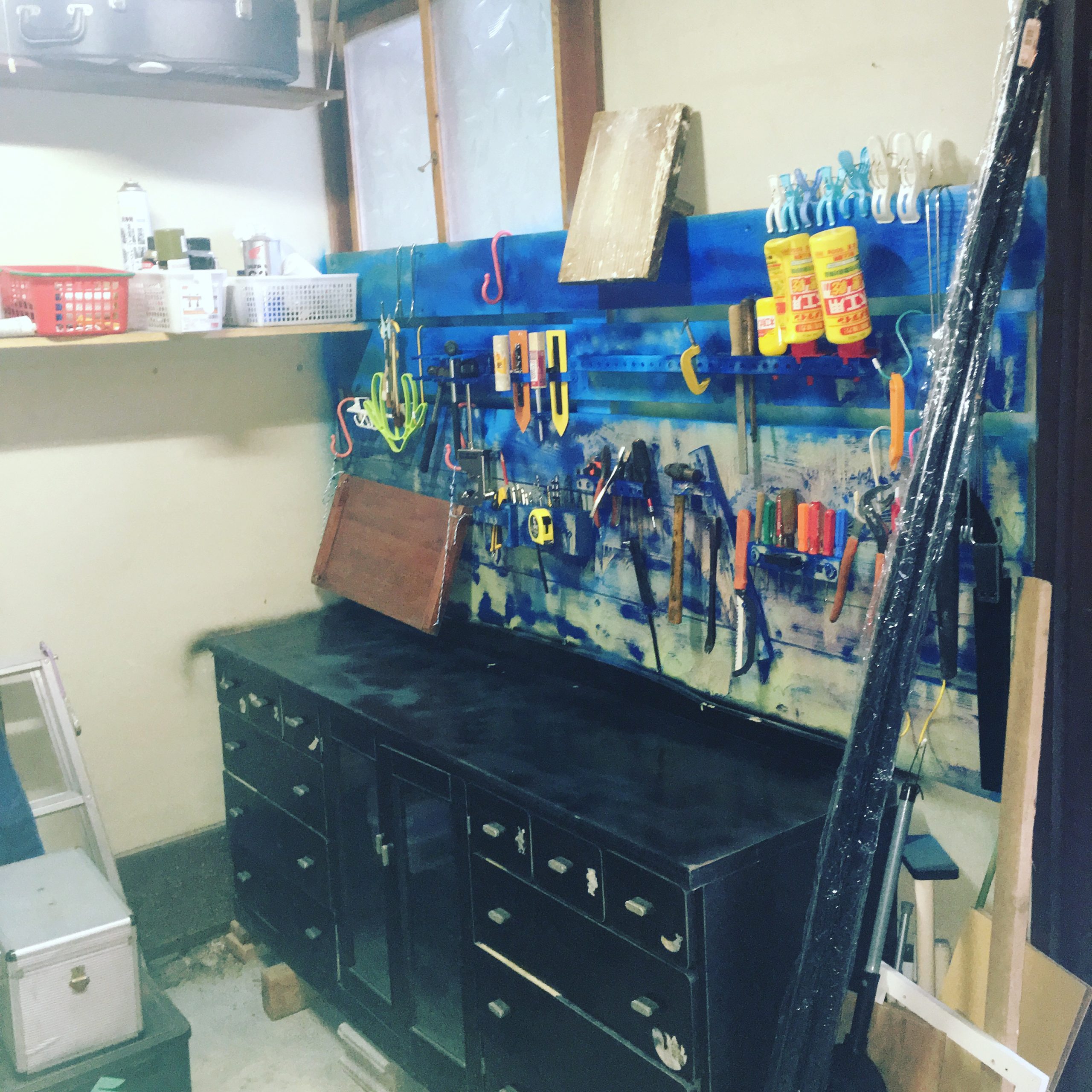 なもんで壁一面に道具が見えるように、これまたあるもので収納道具を作っていたわけです。