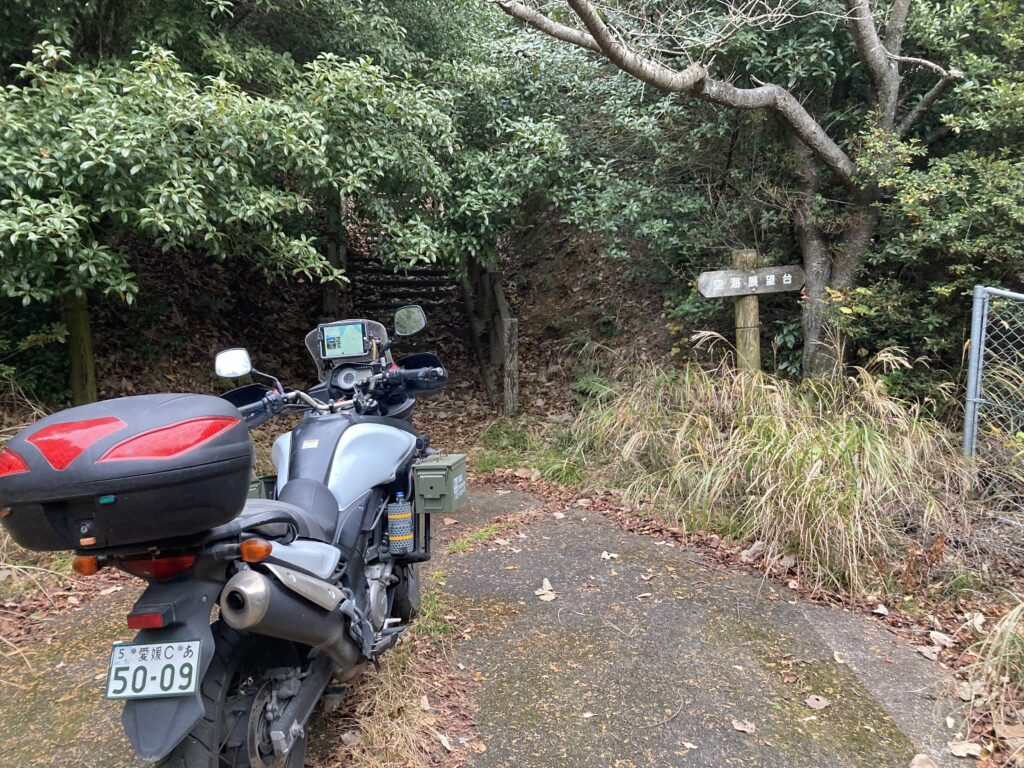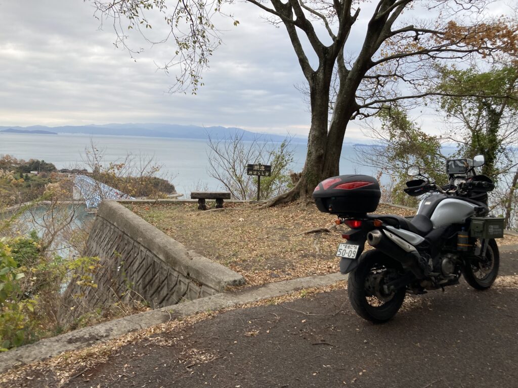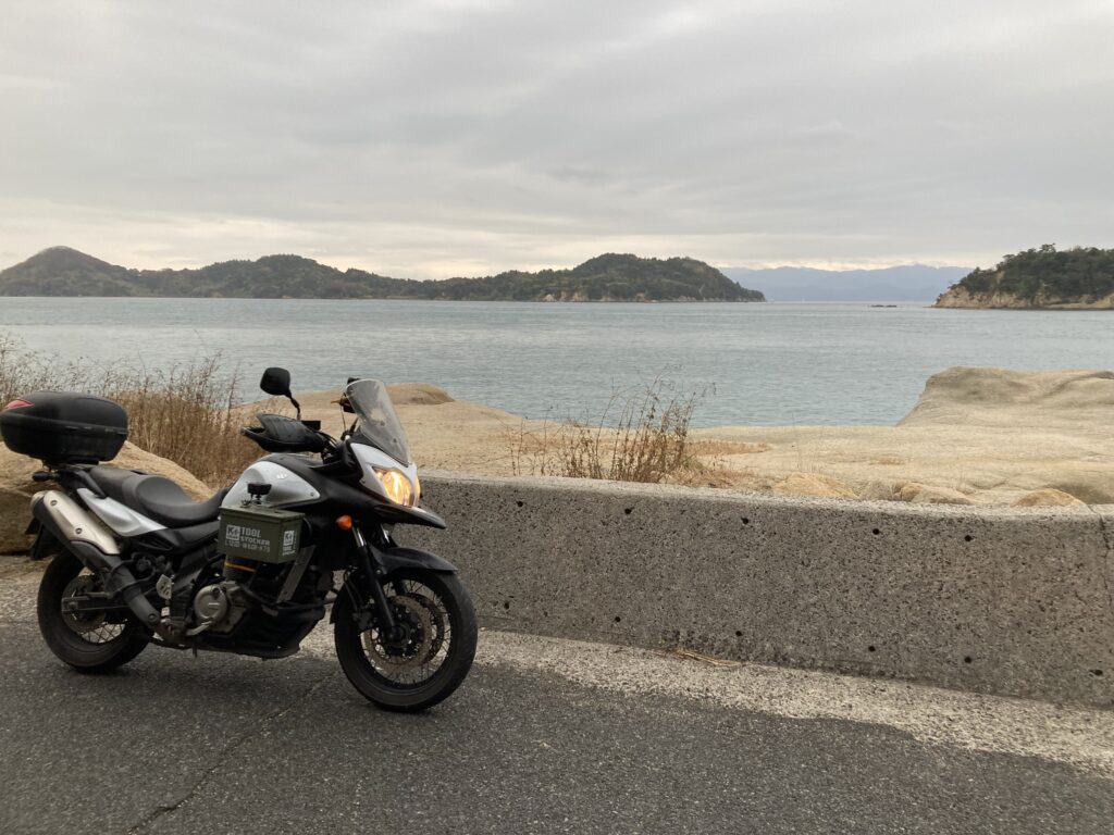 岡村島のフェリー乗り場で佇むバイクの図