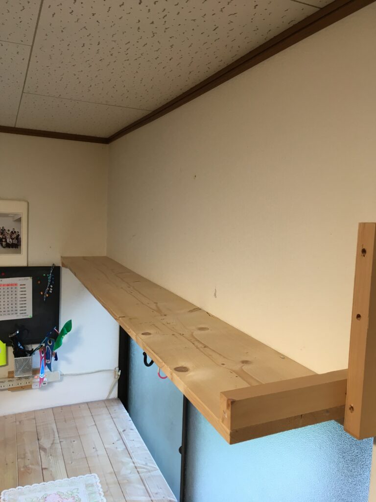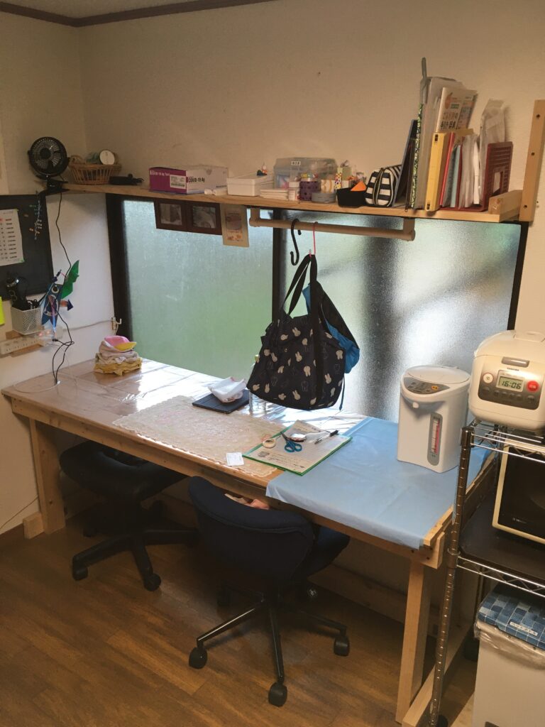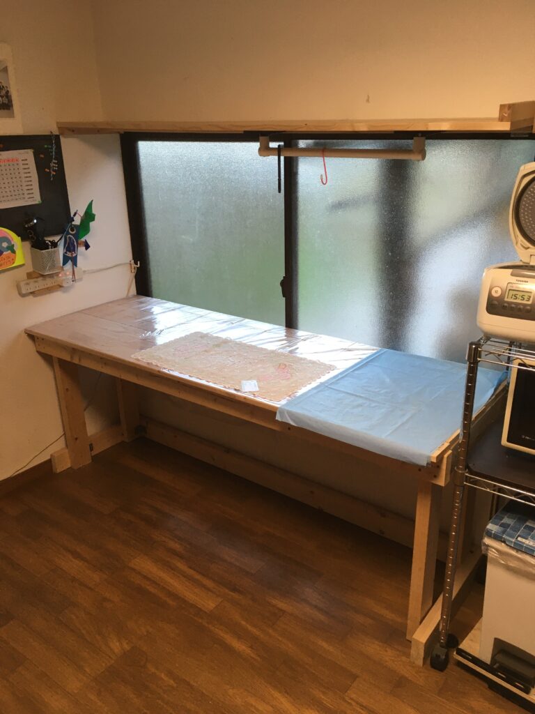 広めの机と棚を作ったことでキッチンで読み書きできる様になりました。
