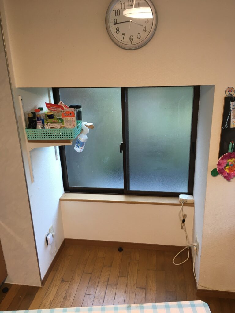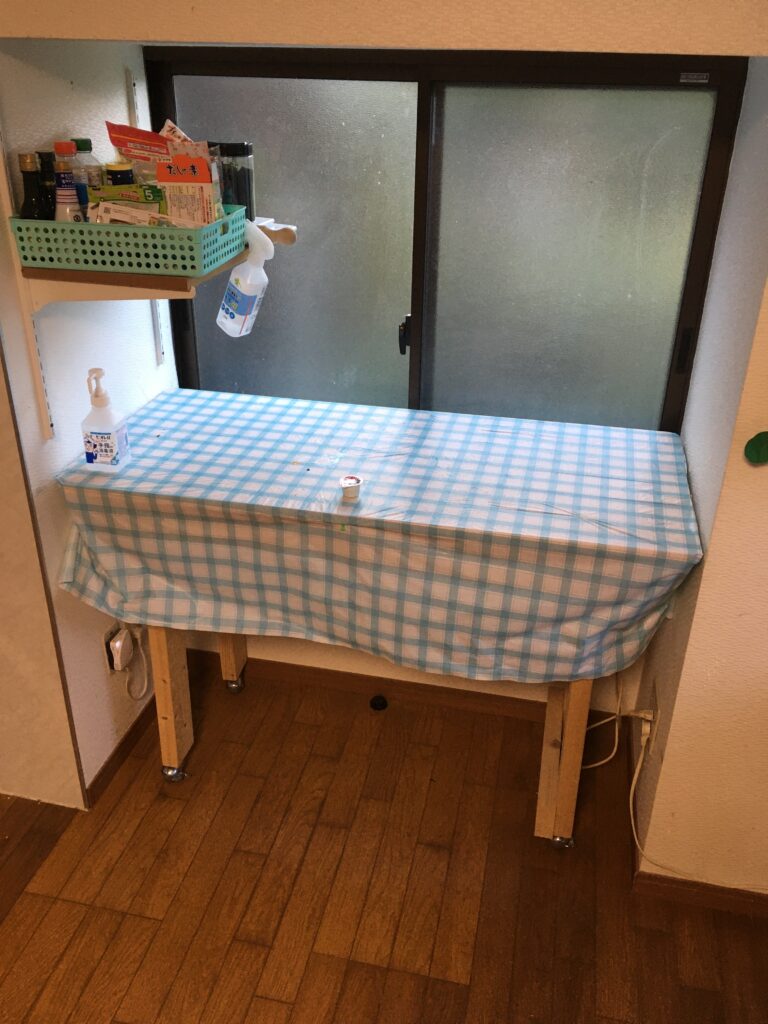 すぐ隣がコンロという位置。ここに机を作ったことで調理したものを仮置きできる様になりました。
