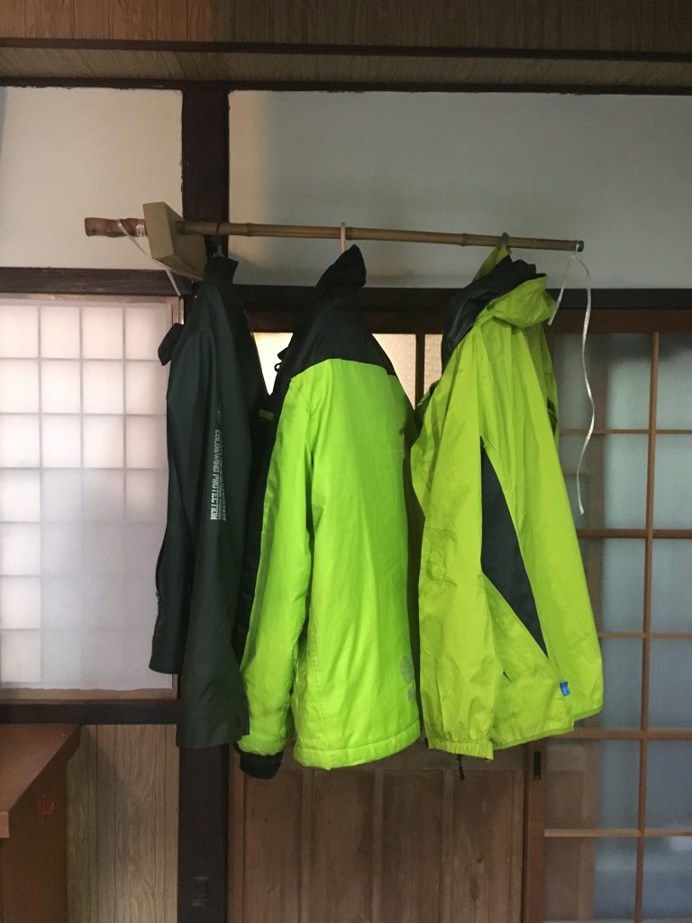 玄関土間にバイク関連の服を掛けれる場所をということで思いついた衣紋掛。