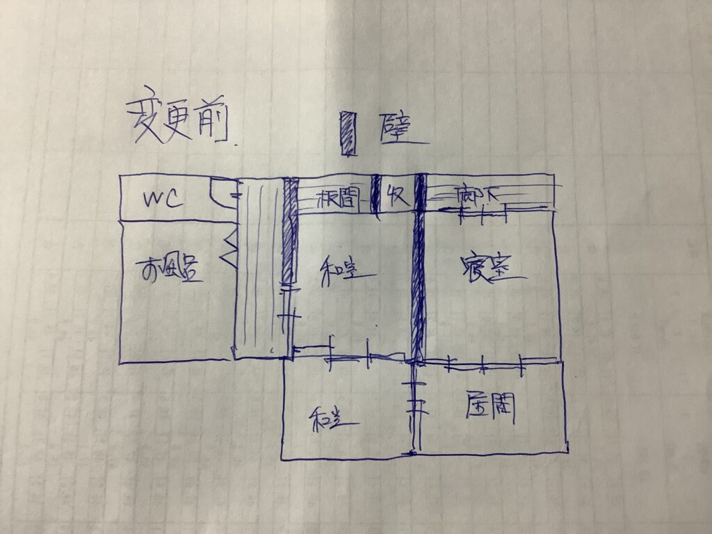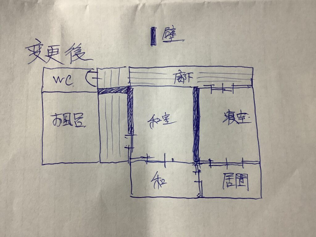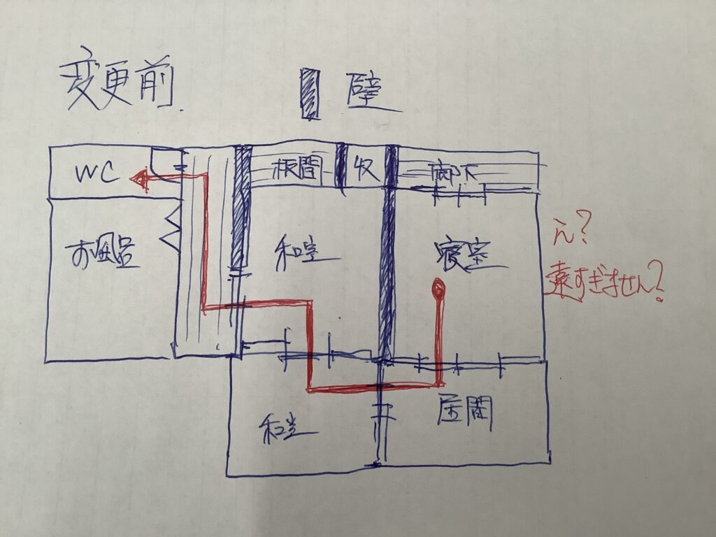 元の間取りだと寝室からトイレまでがかなり動線悪かったんですよ。