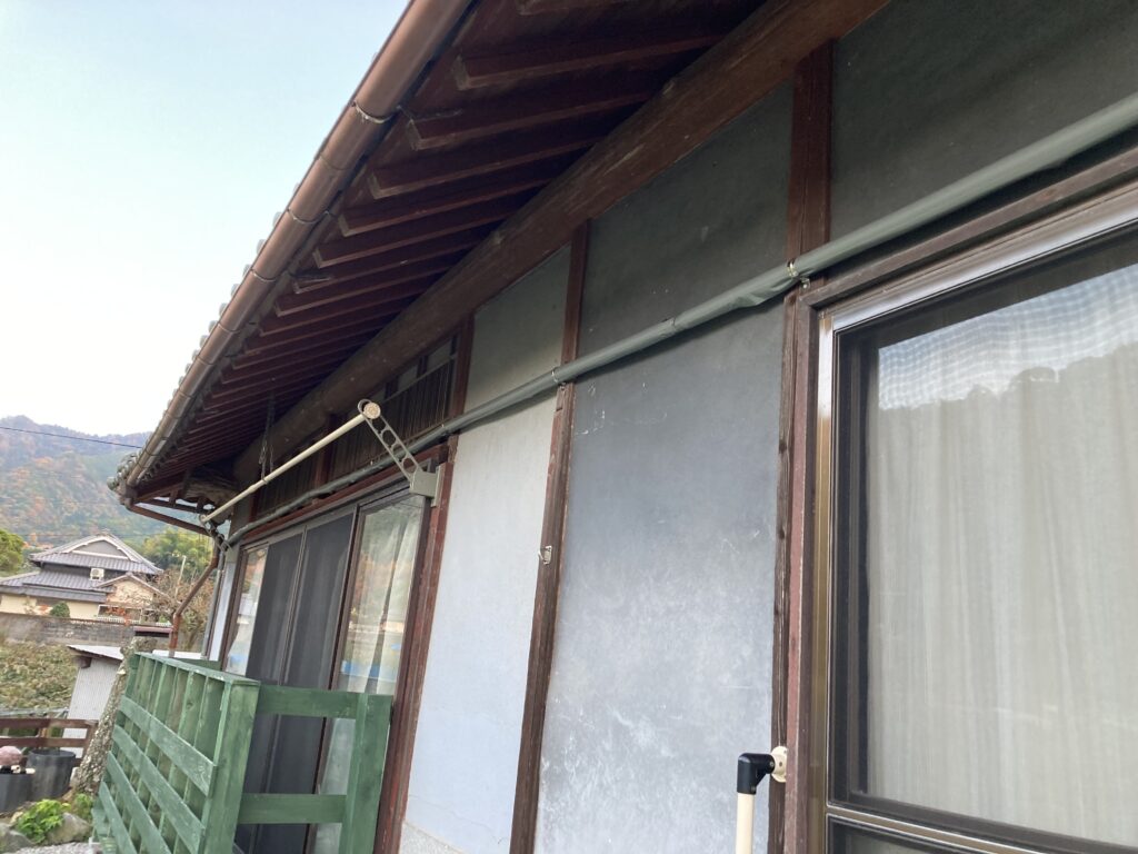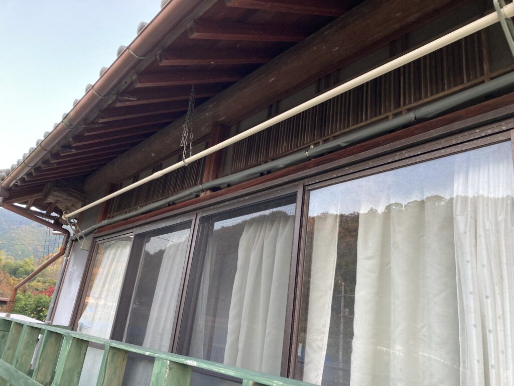縁側のある窓から物干し台のある隣まで管を伸ばしまして。