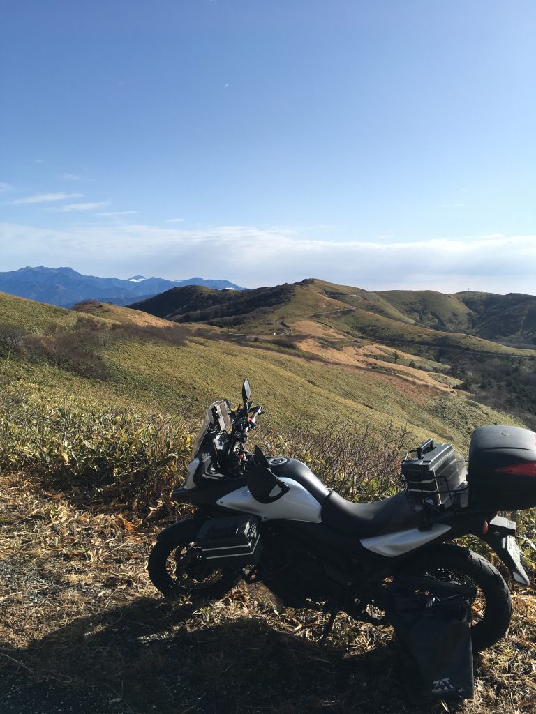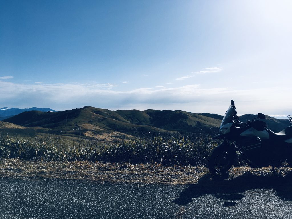 奥に並ぶ山のラインにバイクが映えていいですね。