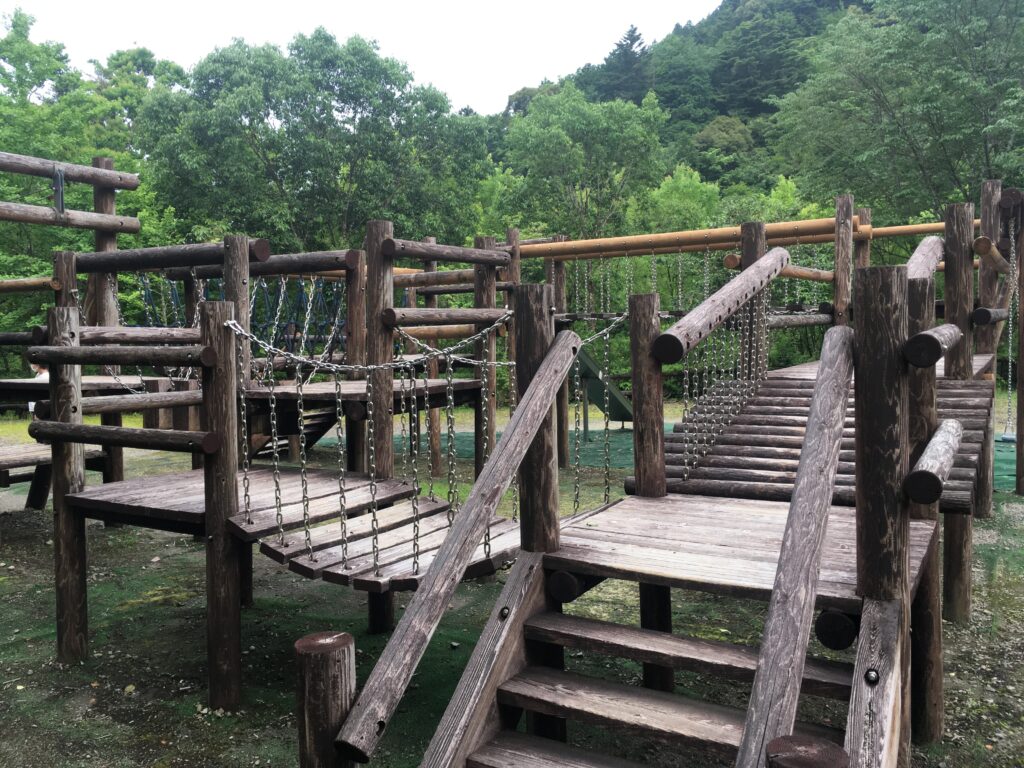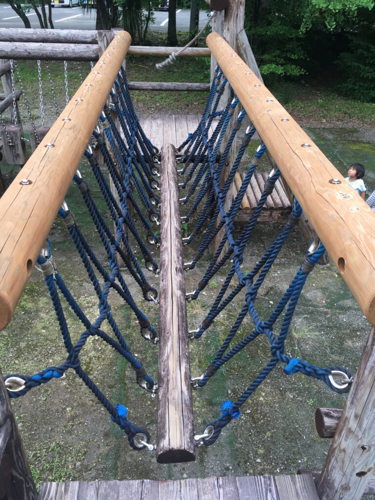 宿に着いたらすぐそばの立派なアスレチック遊具を発見。