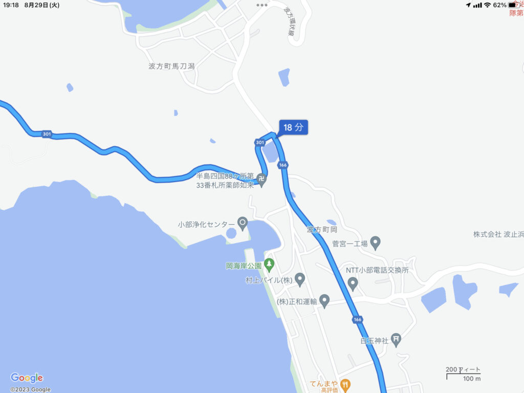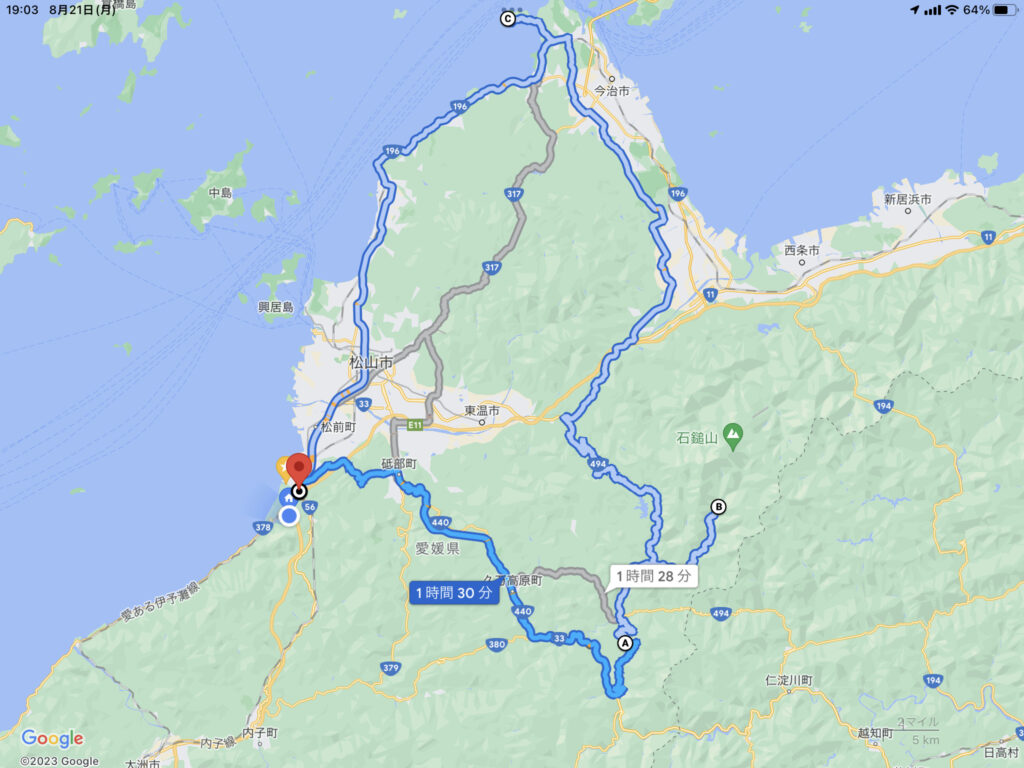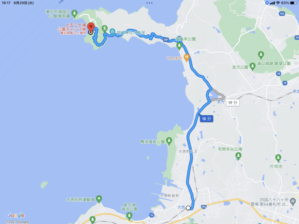 面河渓谷から今治にある七五ヶ浦キャンプ場に行くのに2時間くらい。