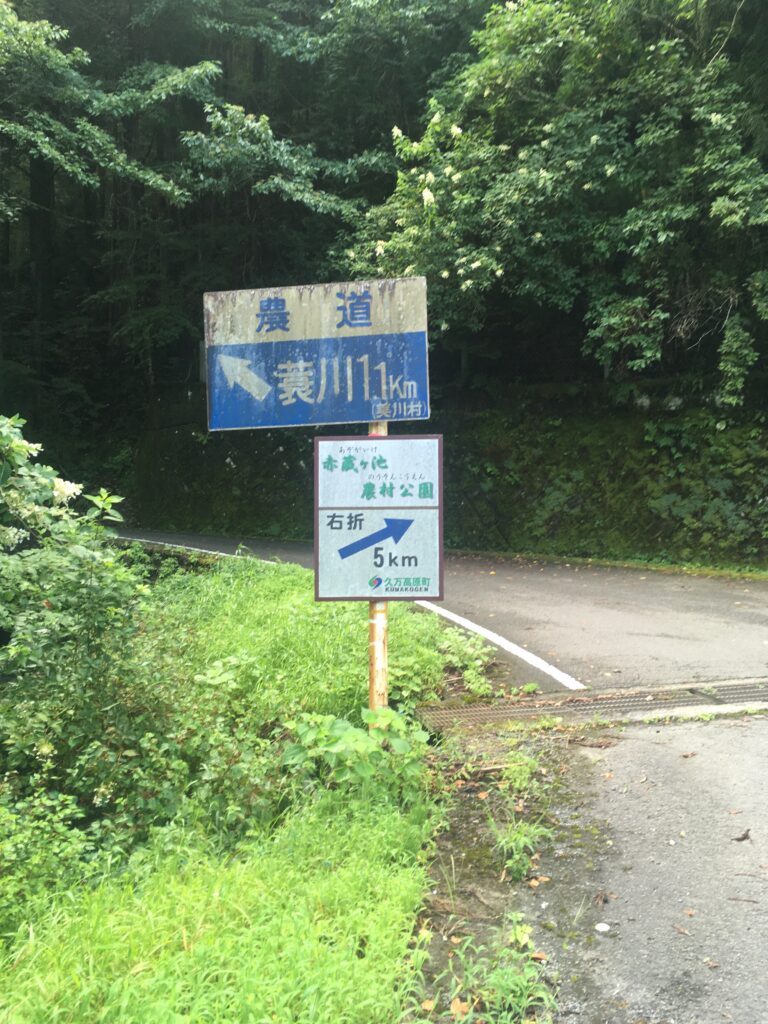 次の分かれ道は右へ。あと5kmガンバ!の看板。