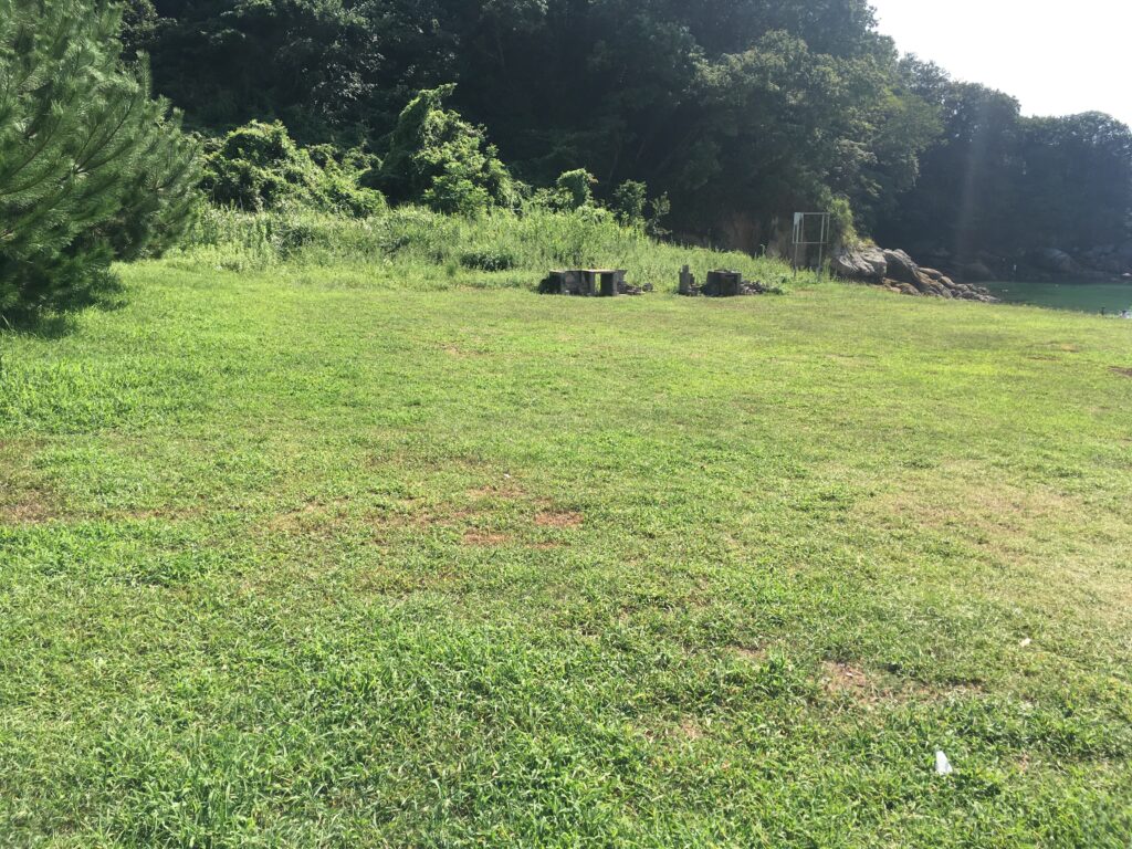 キャンプ場として使う芝生はビーチと比べると狭いけど十分な広さ。