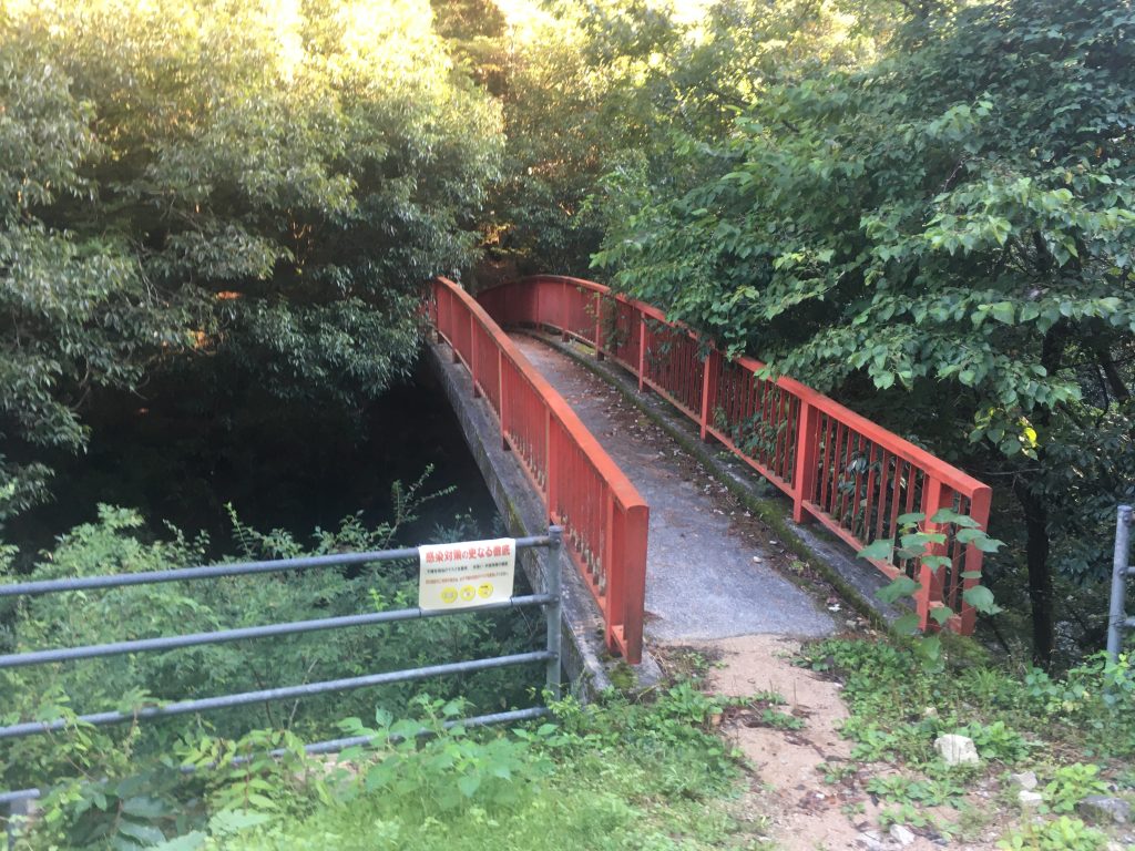森林館に着く手前にある赤橋を渡ってキャンプ場に向かいましたが、なかなかの山道。