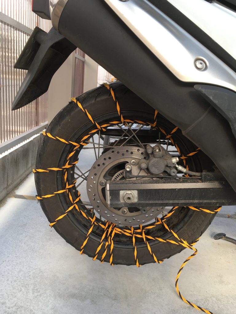 タイヤにしっかり巻き付ける方法なんて知らないからひたすら頑丈になるように試しながら巻かないとだし