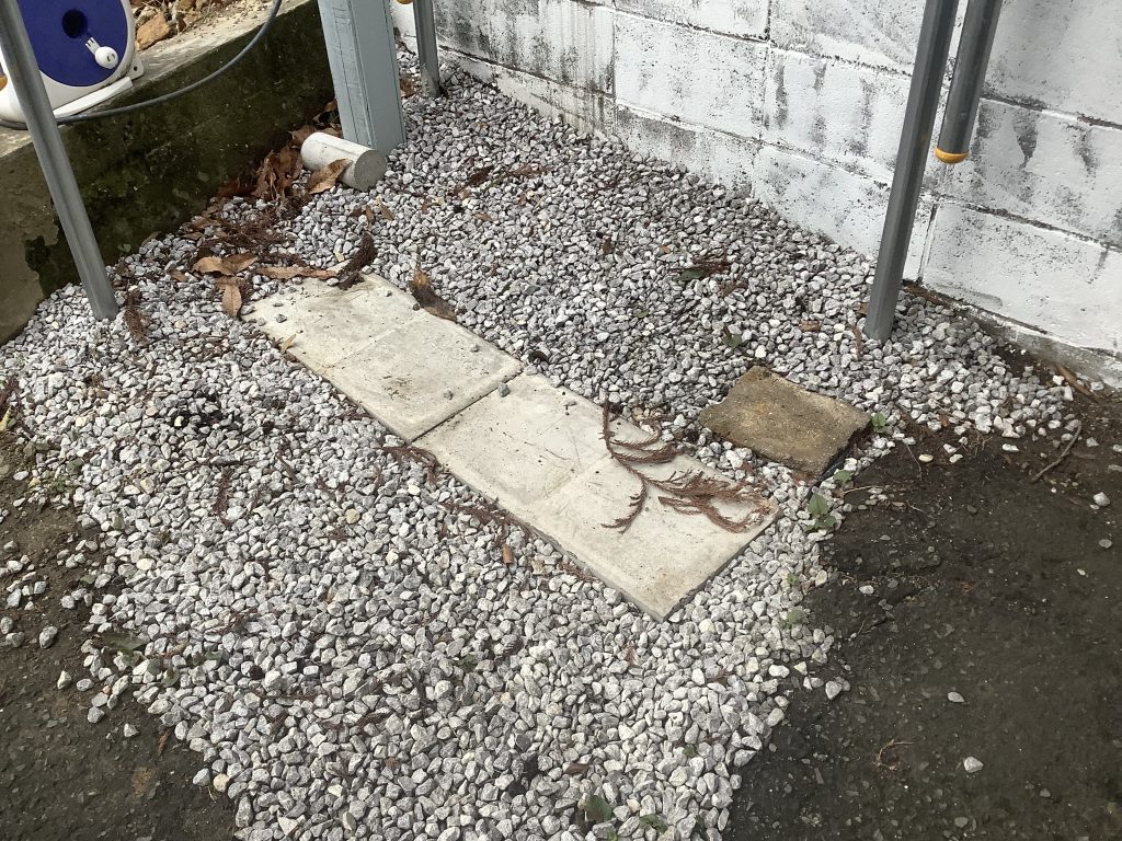 砂利のままだとタイヤが埋まるとのことでコンクリート平版を埋めてみました!