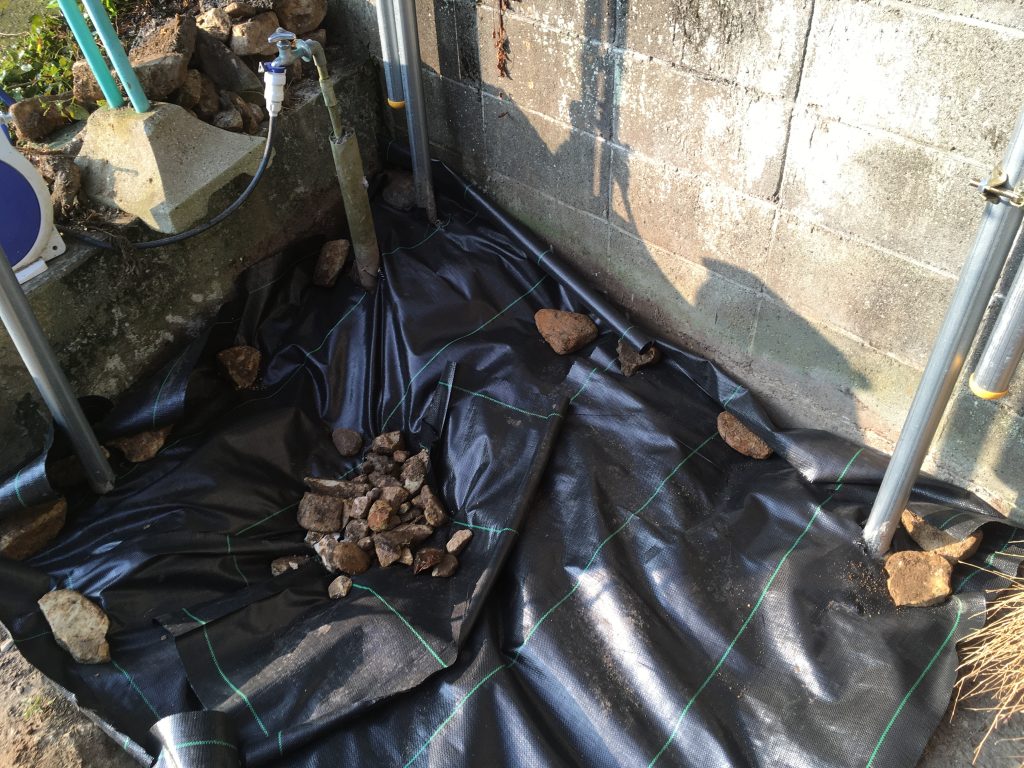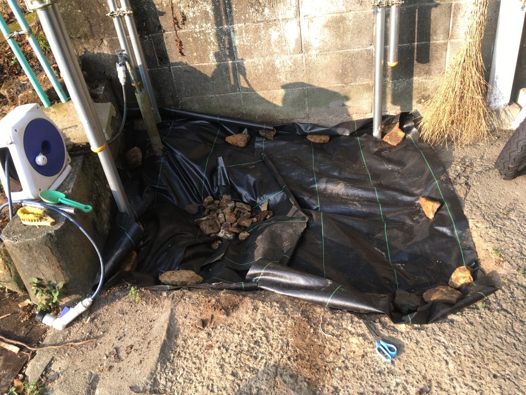 防草シートを敷いてひとまずその辺の石で仮押さえ。